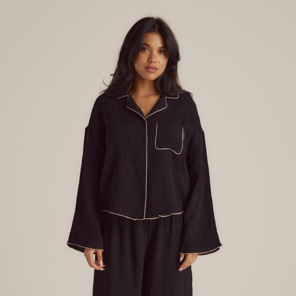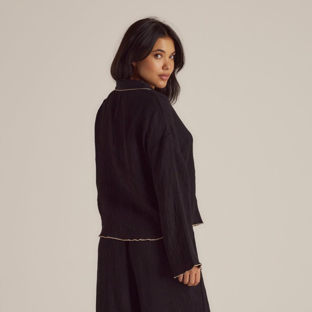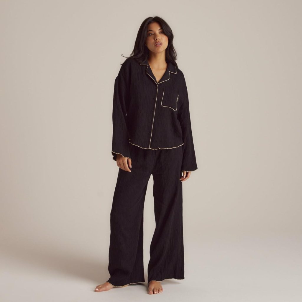 The Crinkle Pyjama Shirt feels cosy, relaxed, and lived-in from the first wear. The lightweight crinkle fabric, finished with a contrast-colour ruffled hem, is cut with a relaxed collar to promise a blissful night’s sleep.